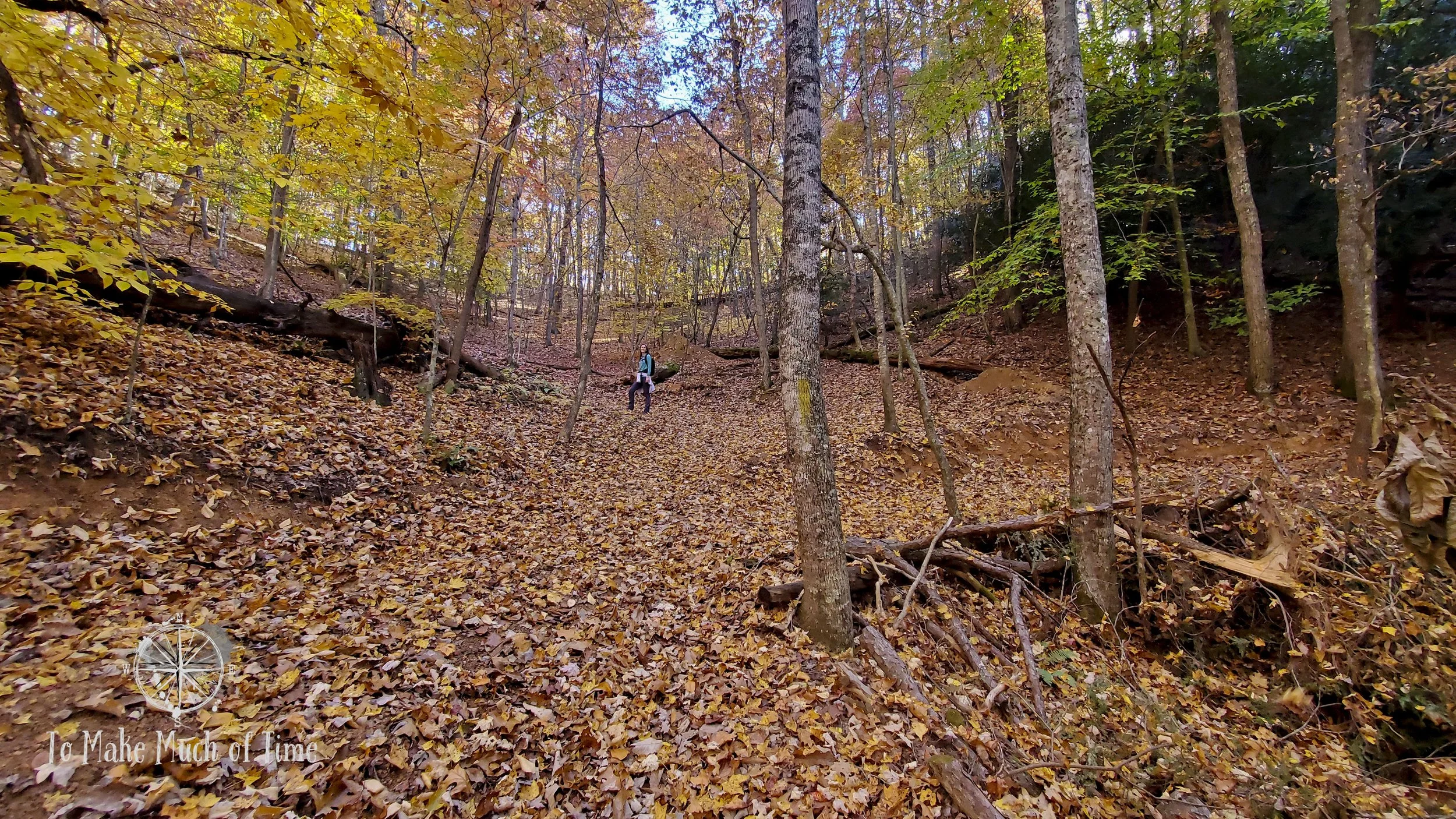 We started the day hiking Raider’s Run Trail, which begins at Parking Lot 2 with an immediate incline. The trail eventually connects to the Old Shawnee Trail, which loops out and around before catching up with the remainder of Raider’s Run. These trails had some elevation change – about 200+ in net gain – and mostly were undulating hills and valleys in the woods. The fall leaves made for beautiful vistas, and we walked through and near a number of Rhododendron thickets. This hike took us just over an hour.